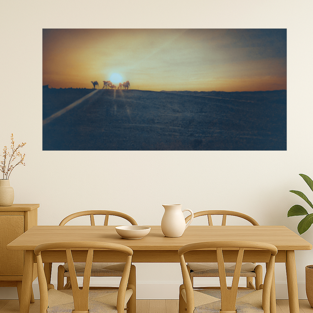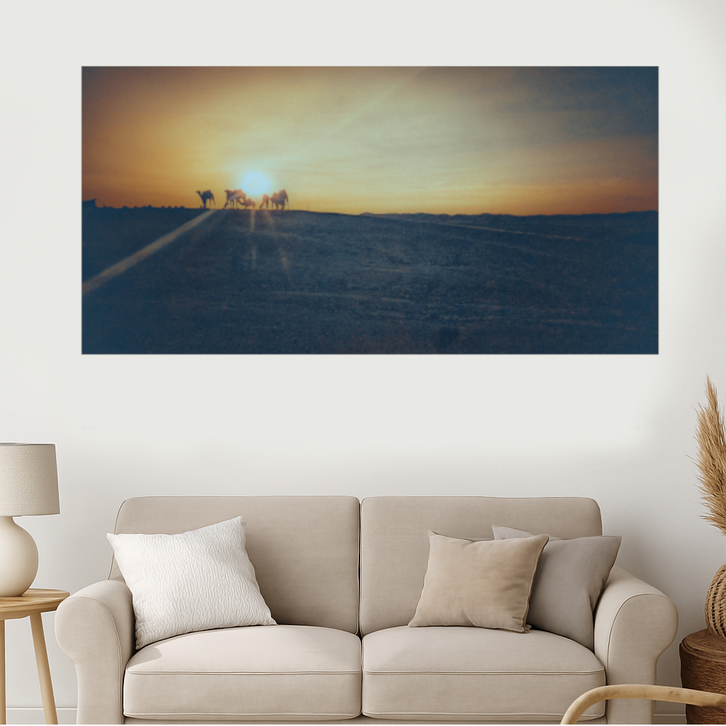 Bring a touch of natural beauty and serenity to your space with this stunning sunset over the Agafay Desert with silhouetted camels on a distant ridge. The subtle interplay of earthy tones and subdued pastels enhances the serene atmosphere, making this piece a soothing addition to any space