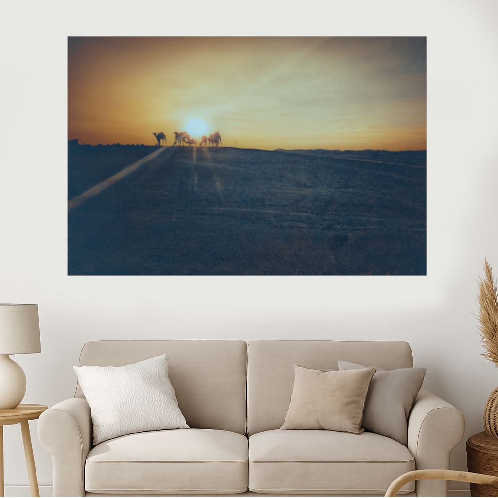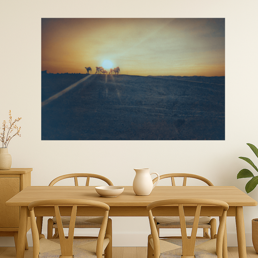 Bring a touch of natural beauty and serenity to your space with this stunning sunset over the Agafay Desert with silhouetted camels on a distant ridge. The subtle interplay of earthy tones and subdued pastels enhances the serene atmosphere, making this piece a soothing addition to any space