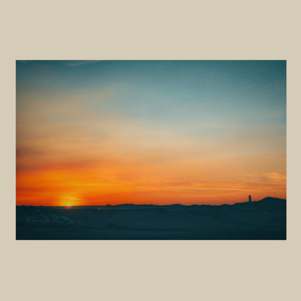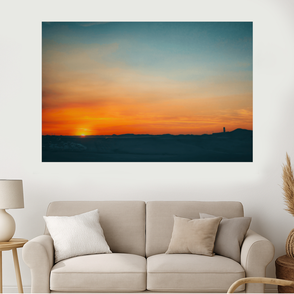 Bring a touch of natural beauty and serenity to your space with this stunning sunset over the Agafay Desert. The gradient sky transitions from a deep orange to soft blue, complementing the rugged silhouette of the distant hills.
