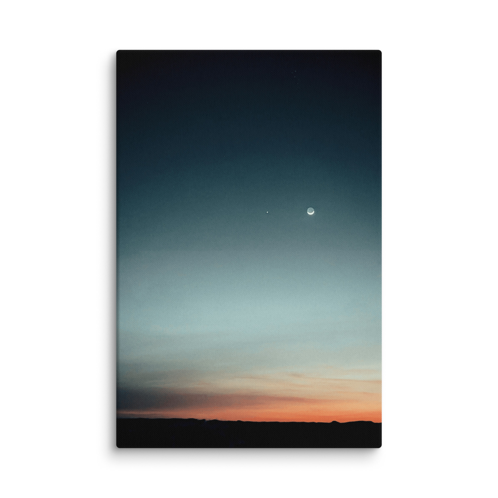 Transport the enchanting transition from day to night over the Agafay Desert in to your desired space. The sun has just set, leaving a warm orange glow over the horizon while the moon takes it’s place high in the sky, accompanied by the brilliant Venus, subtlety illuminating the vast desert in quiet splendour.