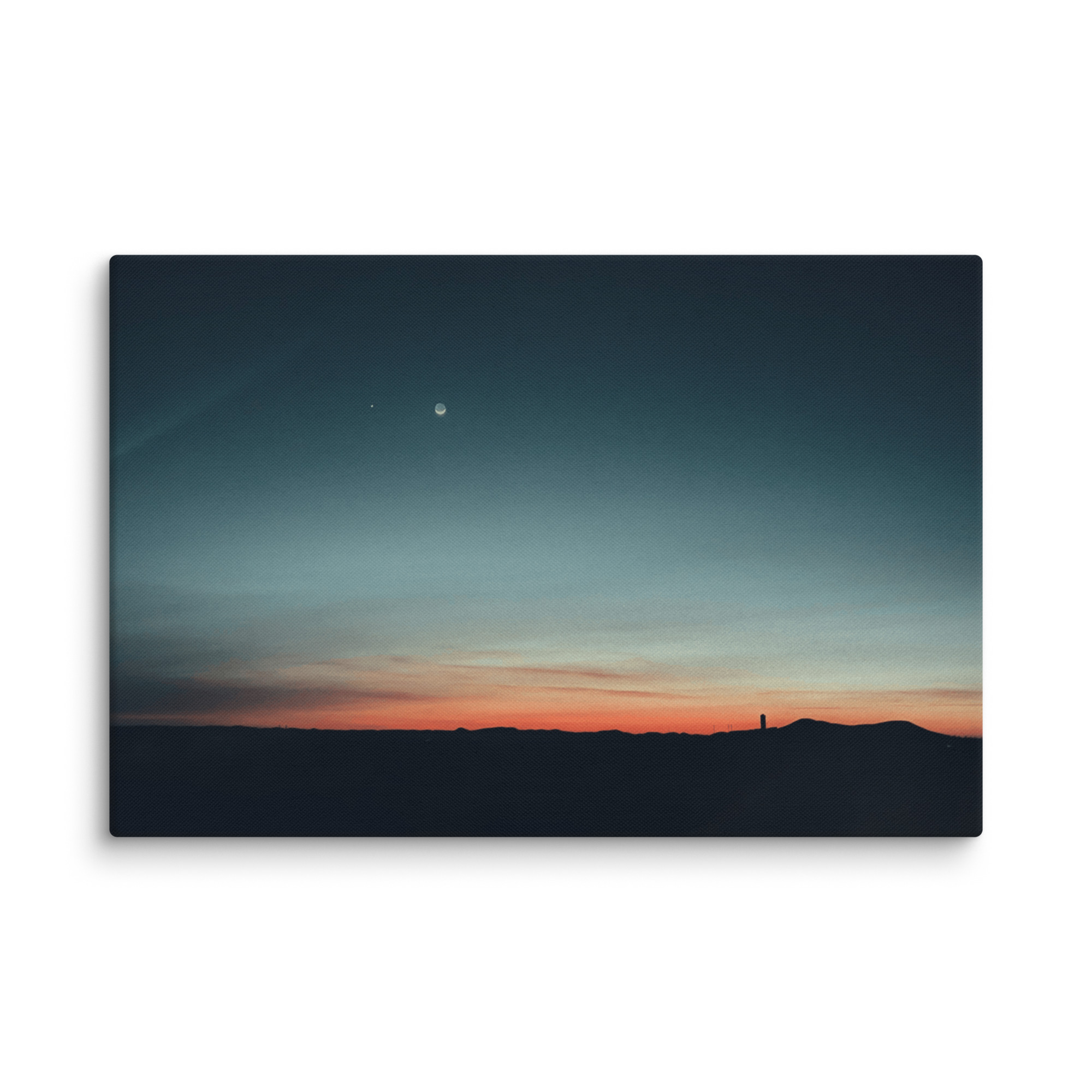 Transport the enchanting transition from day to night over the Agafay Desert in to your desired space. The sun has just set, leaving a warm orange glow over the horizon while the moon takes it’s place high in the sky, accompanied by the brilliant Venus, subtlety illuminating the vast desert in quiet splendour.