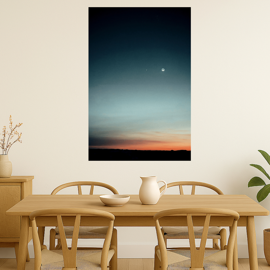 Transport the enchanting transition from day to night over the Agafay Desert in to your desired space. The sun has just set, leaving a warm orange glow over the horizon while the moon takes it’s place high in the sky, accompanied by the brilliant Venus, subtlety illuminating the vast desert in quiet splendour.