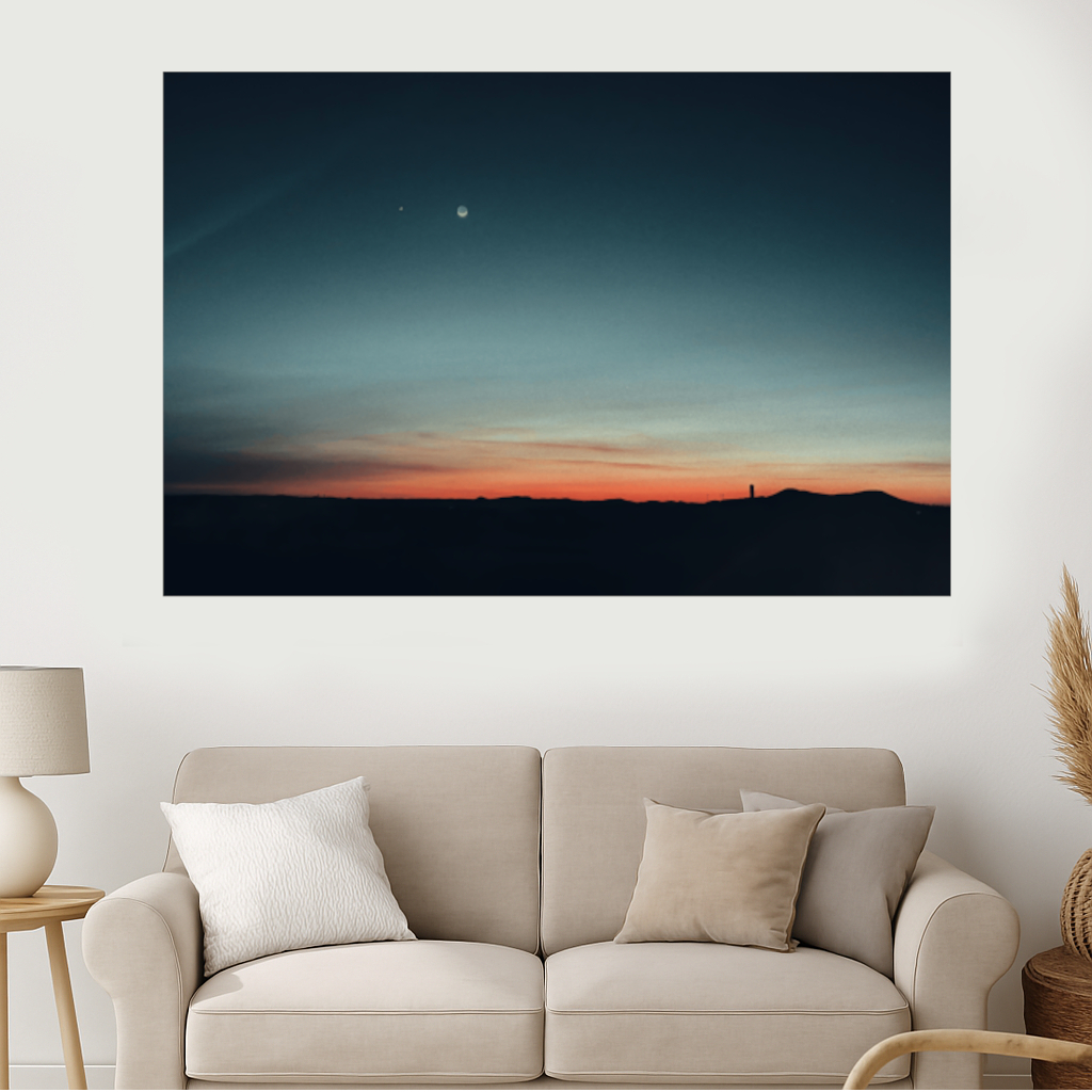 Transport the enchanting transition from day to night over the Agafay Desert in to your desired space. The sun has just set, leaving a warm orange glow over the horizon while the moon takes it’s place high in the sky, accompanied by the brilliant Venus, subtlety illuminating the vast desert in quiet splendour.