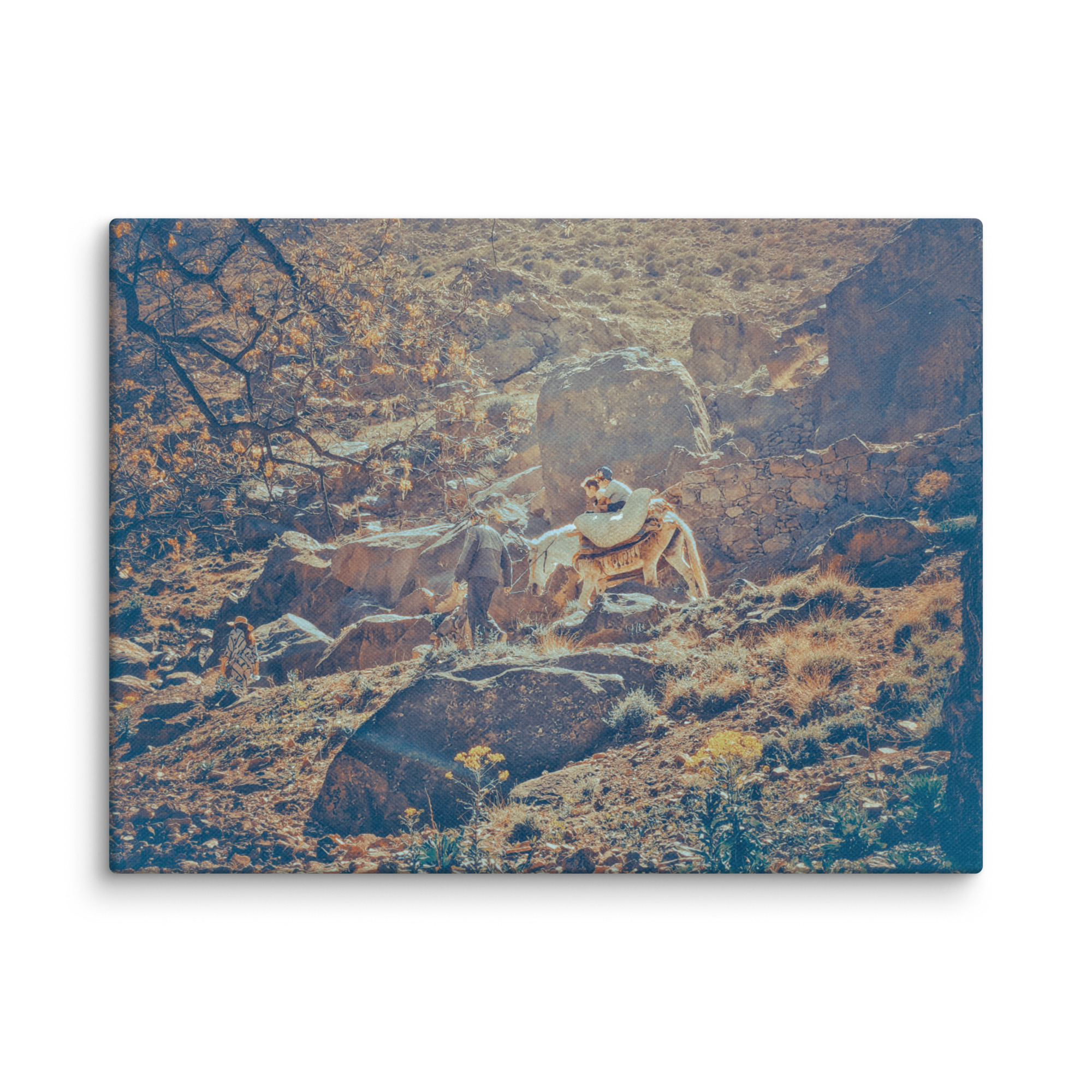 Grace your space with the golden glow and autumnal hues of this image, featuring a local villager guiding his donkey, while two children ride along, on a winding path through the majestic Atlas Mountains of Morocco.