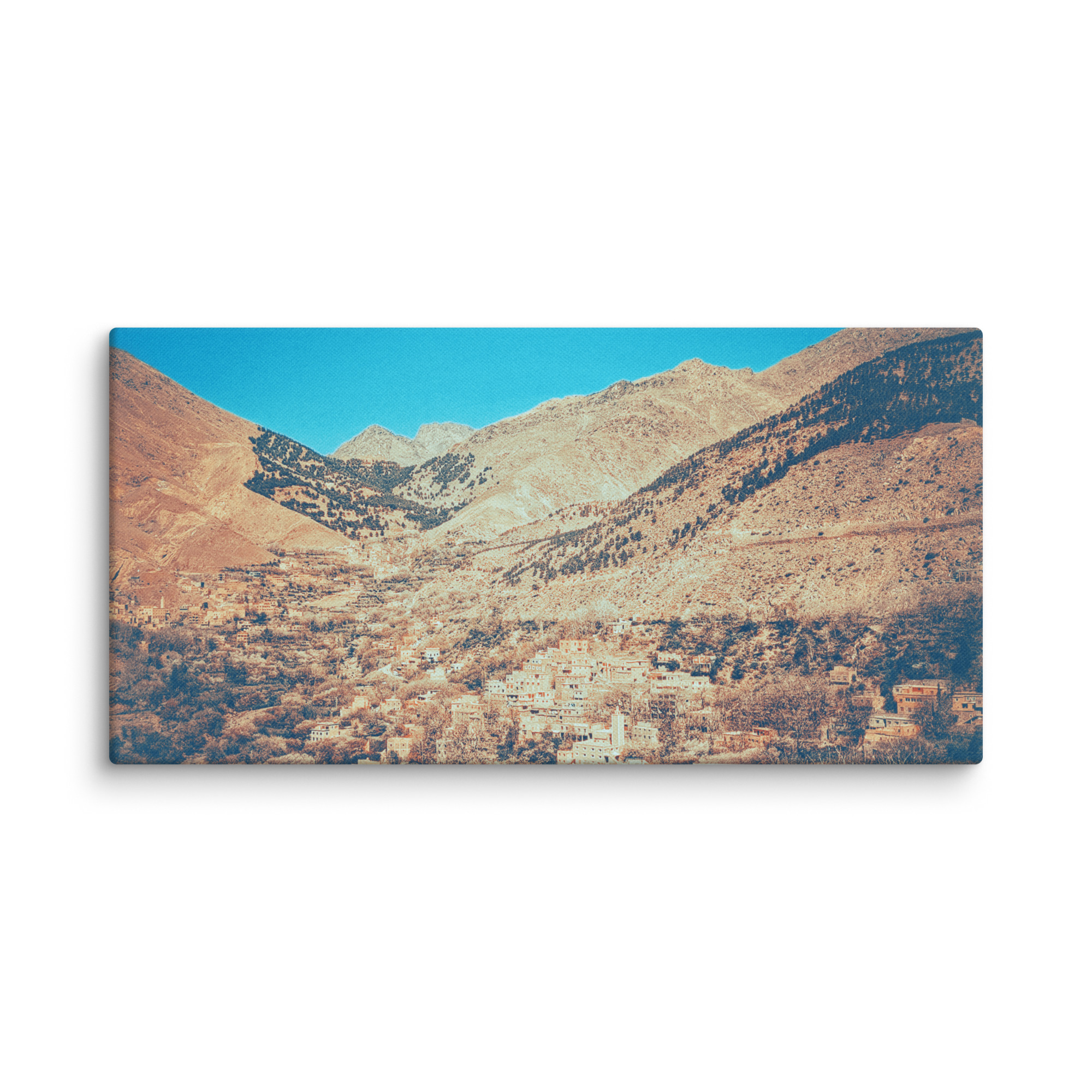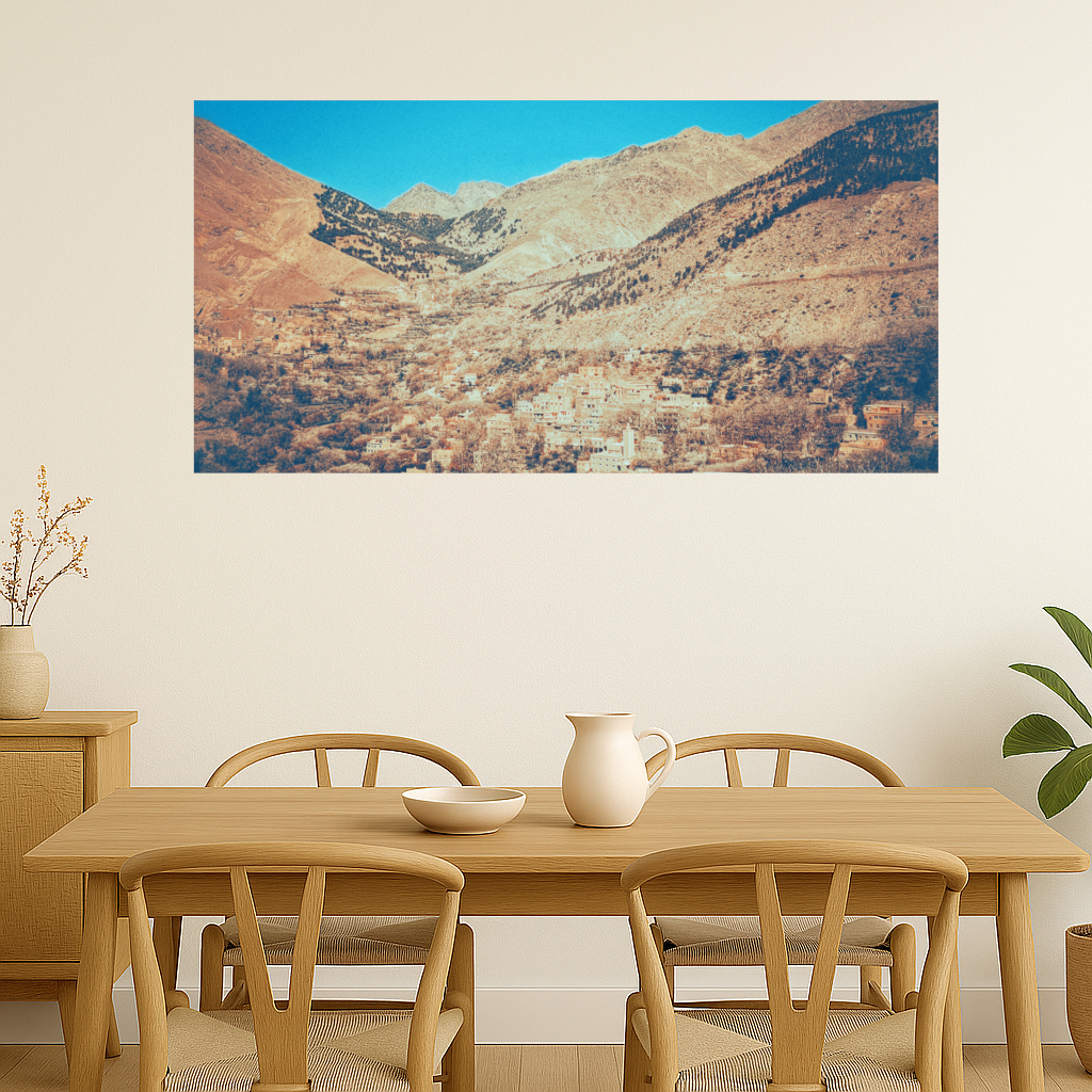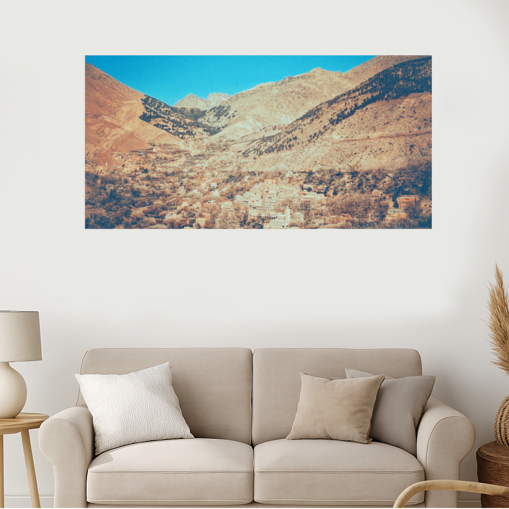 The vivid blue sky forms a striking contrast against the earthy tones of the towering Atlas Mountains, where a charming rustic village lies tucked within the expanse of a sprawling valley.
