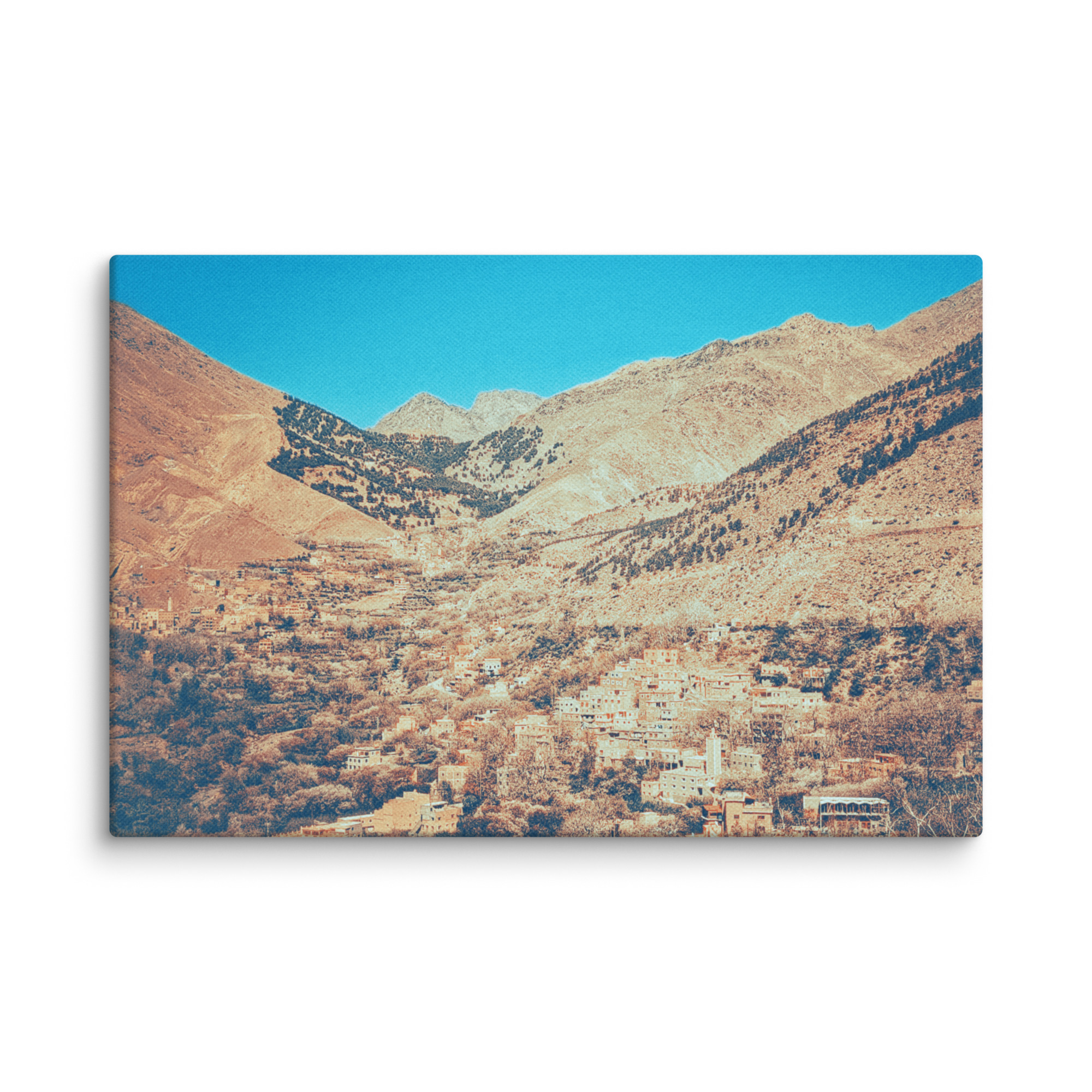 The vivid blue sky forms a striking contrast against the earthy tones of the towering Atlas Mountains, where a charming rustic village lies tucked within the expanse of a sprawling valley.