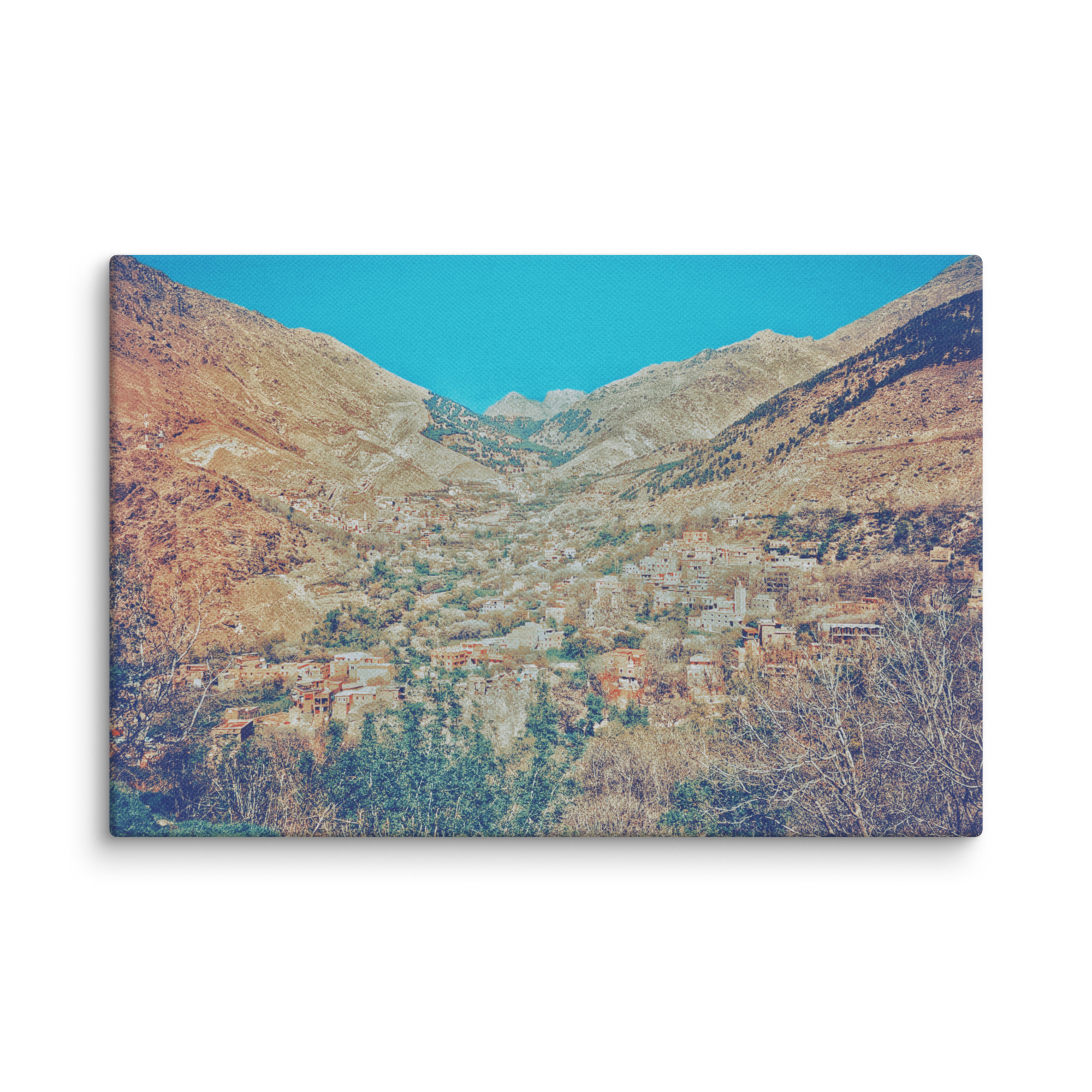 The vivid blue sky forms a striking contrast against the earthy tones of the towering Atlas Mountains, where a charming rustic village lies tucked within the expanse of a sprawling valley.
