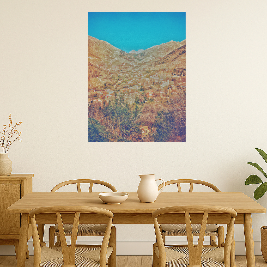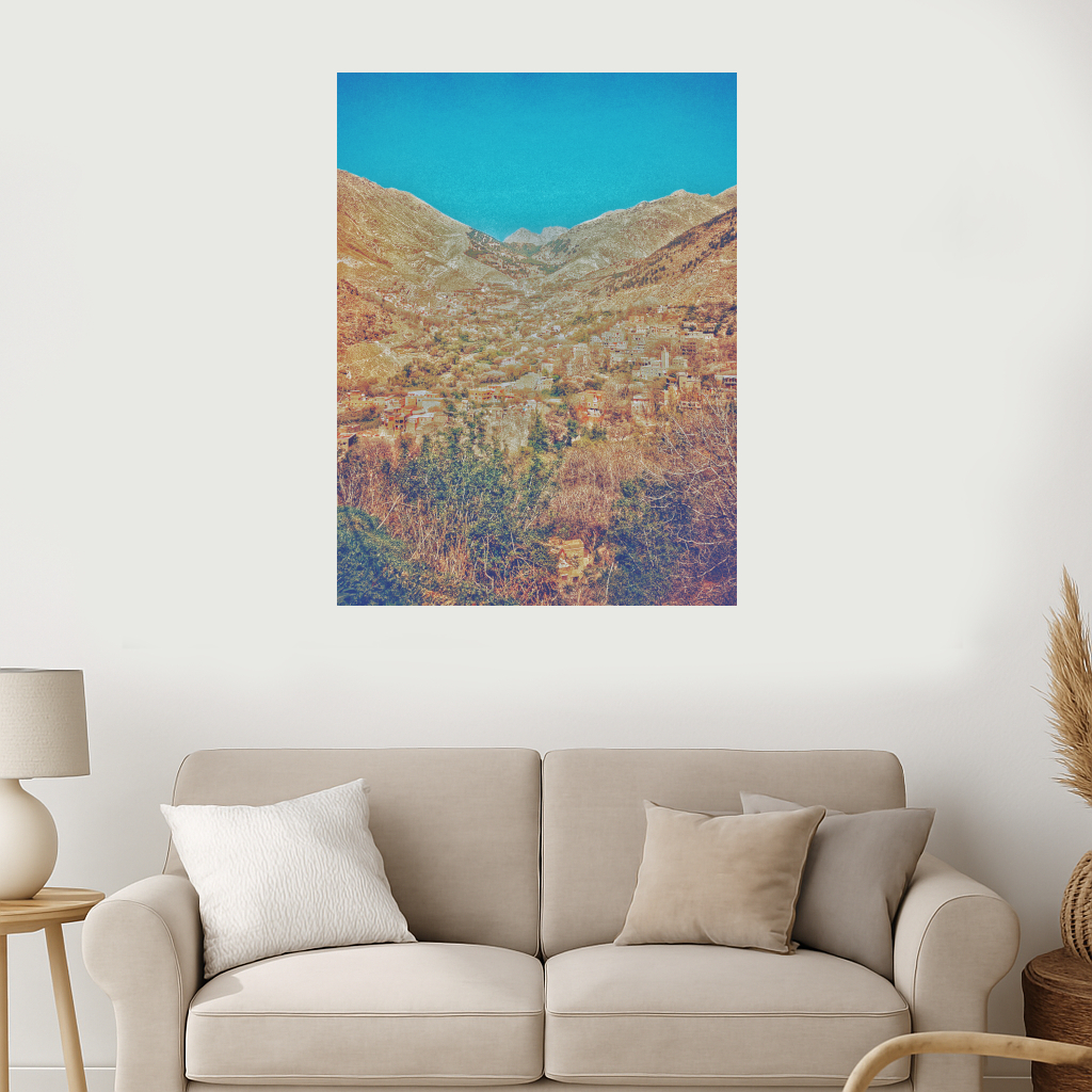 The vivid blue sky forms a striking contrast against the earthy tones of the towering Atlas Mountains, where a charming rustic village lies tucked within the expanse of a sprawling valley.