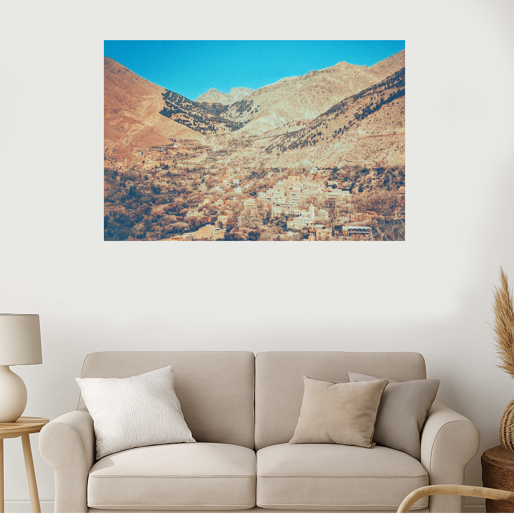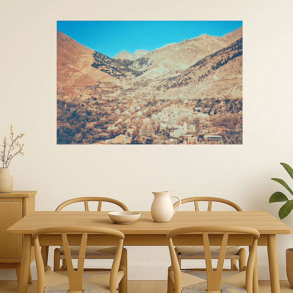 The vivid blue sky forms a striking contrast against the earthy tones of the towering Atlas Mountains, where a charming rustic village lies tucked within the expanse of a sprawling valley.