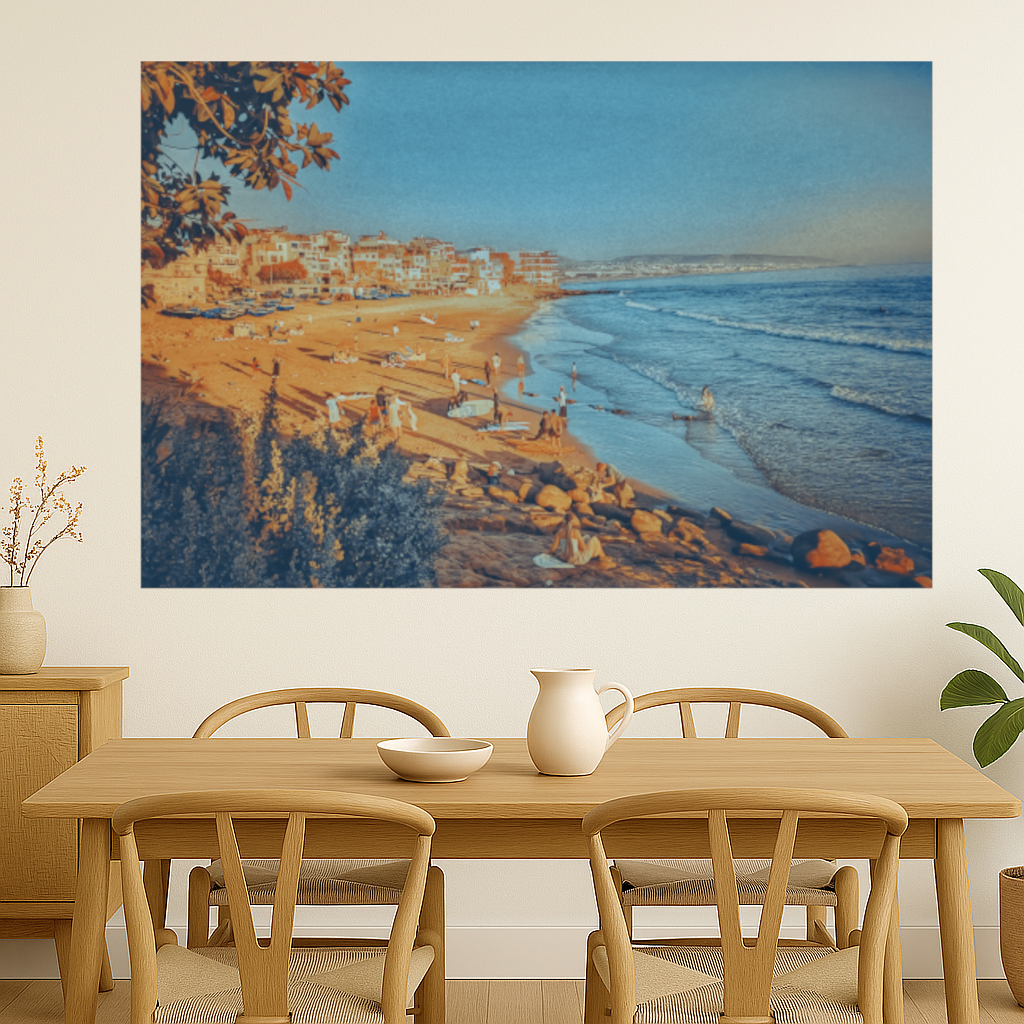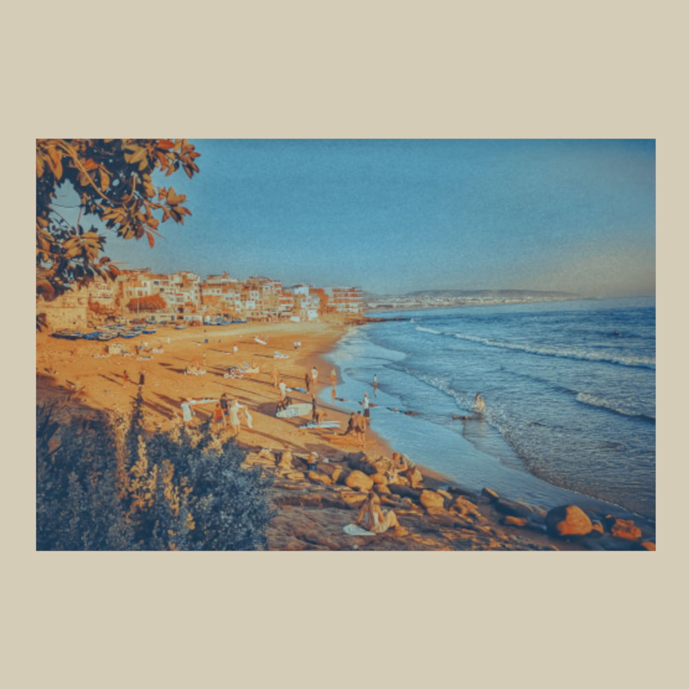 Transport yourself to the tranquil shores of Taghazout, Morocco with this image capturing the serene beauty of the fishing village’s beach on a sunny summer’s day.